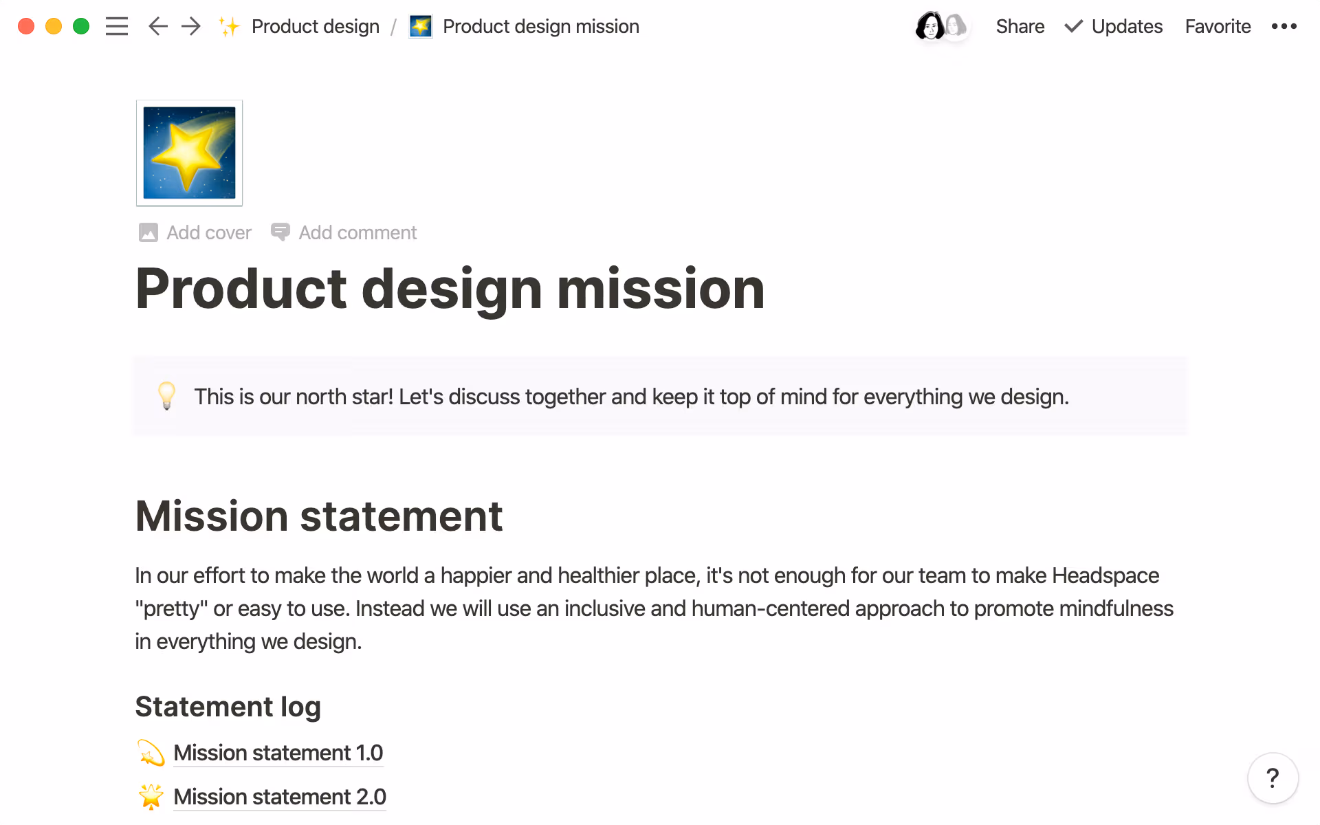 Using Notion as a single source of truth, the team’s mission statement is front and center on their wiki, with past versions saved to illustrate how they’ve refined what they’re doing and why. Alongside product requirement documents, the design system, and other key resources, the mission adds structure and objectivity to a distinctly aspirational vision.
